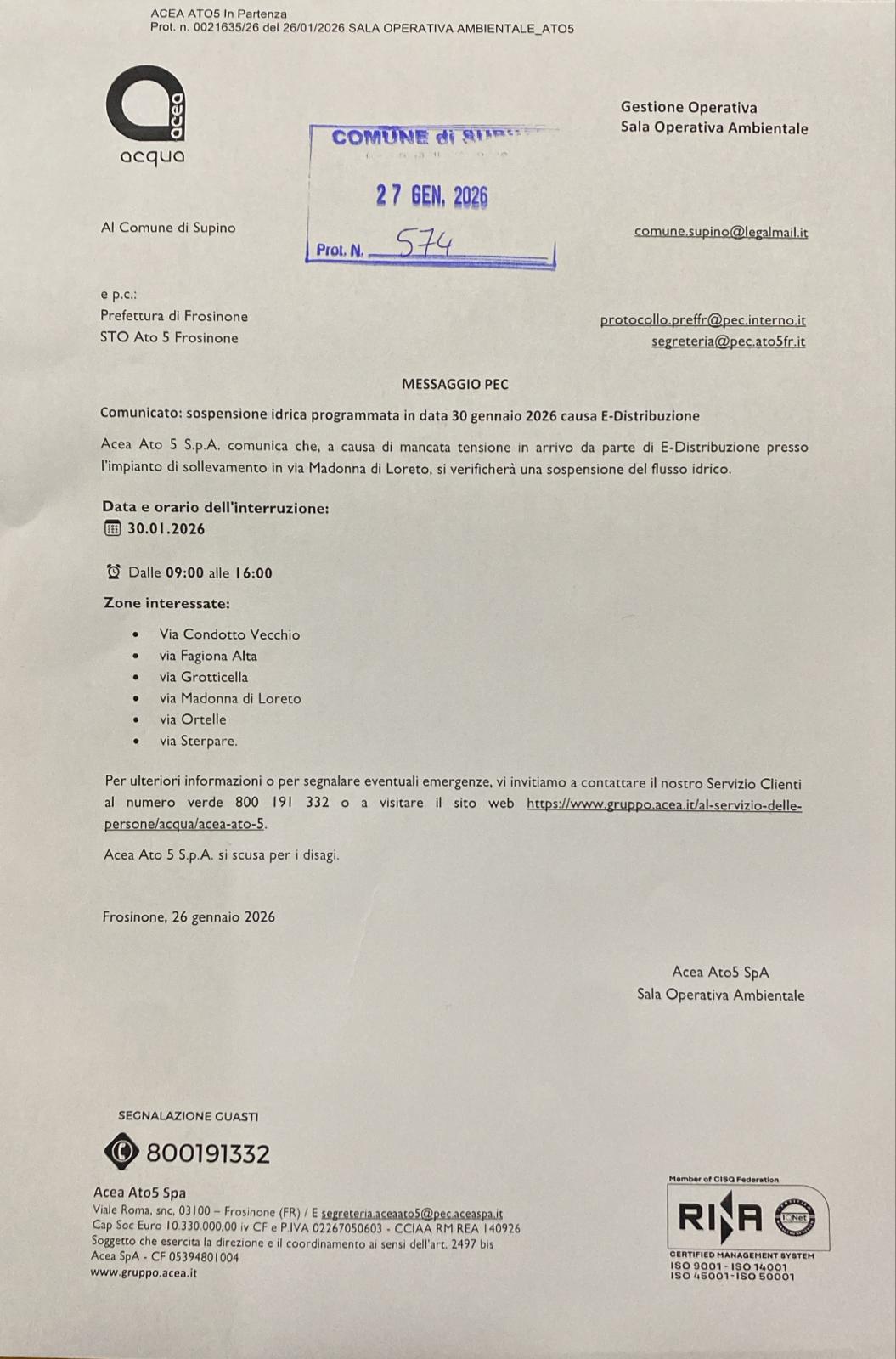- Preavviso di interruzione energia elettrica sul territorio del Comune di Supino.