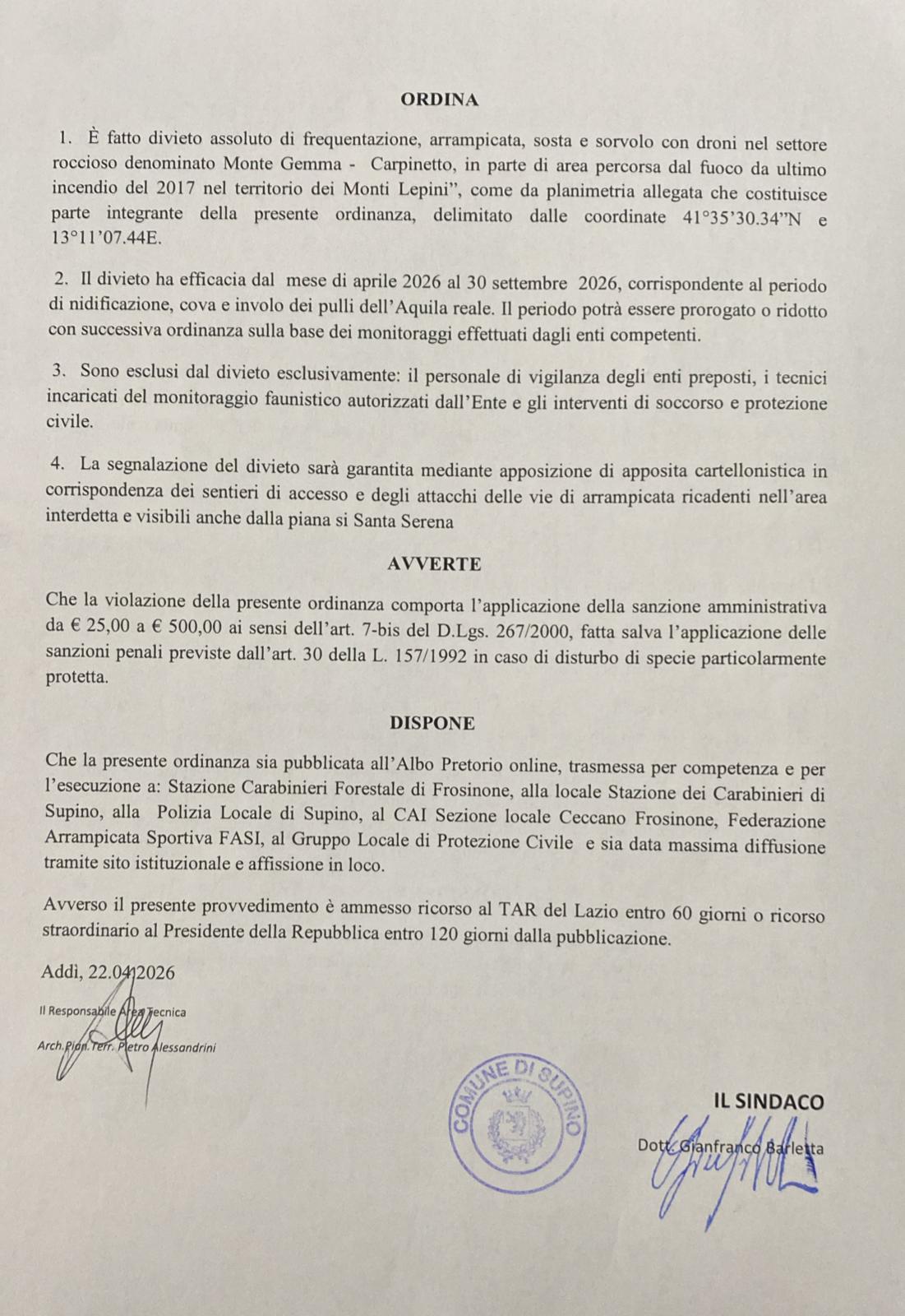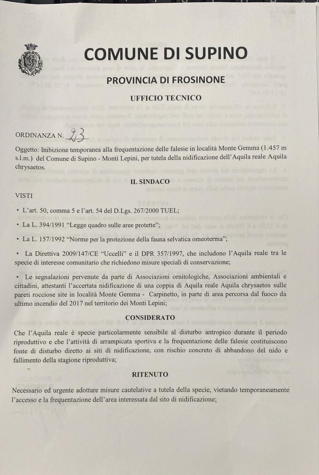 Inibizione temporanea alla frequentazione delle falesie in località Monte Gemma del Comune di Supino- Monti Lepini, per tutela della nidificazione dell'Aquila Reale - Aquila chrysaetos, essendo specie particolarmente sensibile al disturbo antropico durante il periodo riproduttivo e che l'attività di arrampicata sportiva e la frequentazione delle falesie costituiscono fonte di disturbo ai siti di nidificazione, con rischio di abbandono del nido e fallimento della stagione riproduttiva.